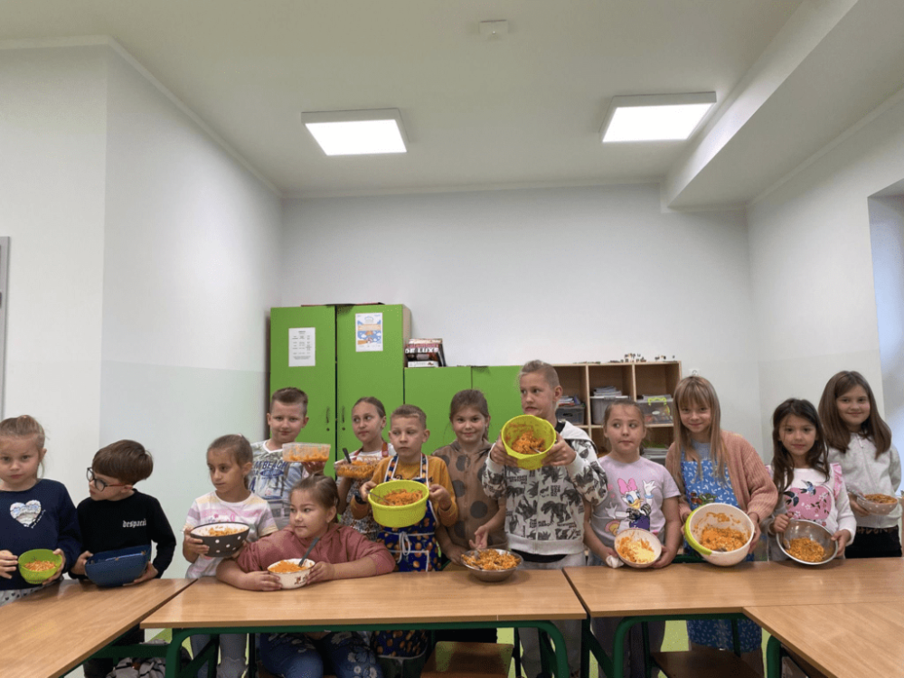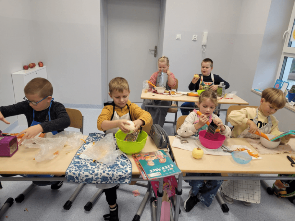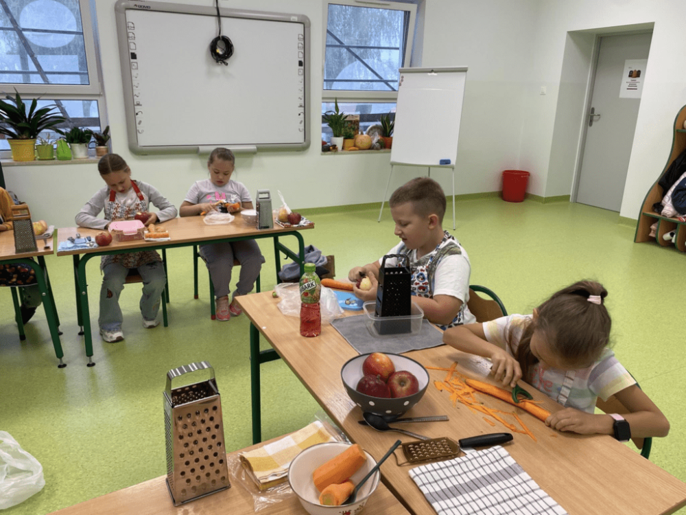 Dzisiaj w naszej szkole zapachniało jabłkami i marchewką! Uczniowie klas 1–3 obchodzili Dzień Jabłka, podczas którego nie tylko świetnie się bawili, ale też wiele się nauczyli. Dzieci samodzielnie przygotowały pyszną i zdrową sałatkę jabłkowo-marchewkową. Poznały etapy rozwoju jabłka – od kwiatu do dojrzałego owocu. Przyglądały się budowie jabłka – odkrywając, co kryje się w środku. Wykonały także piękne, kreatywne prace plastyczne z motywem jabłka. To był smakowity, kolorowy i pełen uśmiechów dzień!