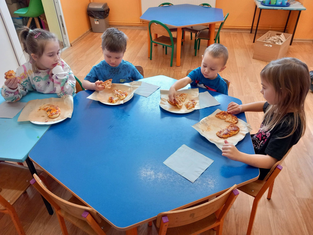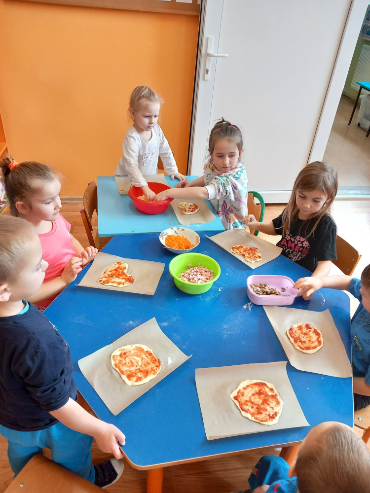 Dzieci wcieliły się w rolę kucharzy i z wielkim zaangażowaniem przygotowywały własną pizzę. Już sam proces tworzenia sprawił im ogromną radość – od wyrabiania i formowania drożdżowych kulek, przez smarowanie ciasta sosem pomidorowym, aż po dobieranie ulubionych dodatków i posypywanie całości serem. Gdy pizze były gotowe, zostały przekazane do kuchni, gdzie trafiły do piekarnika. Po upieczeniu przedszkolaki z apetytem degustowały przygotowane przez siebie wypieki. Cały dzień przebiegał w pogodnej i radosnej atmosferze. Podczas tego wydarzenia dzieci poznały historię pizzy oraz dowiedziały się, z jakiego kraju pochodzi to popularne danie. Wspólnie doszliśmy również do wniosku, że pizza wykonana własnoręcznie jest nie tylko smaczniejsza, ale i zdrowsza.