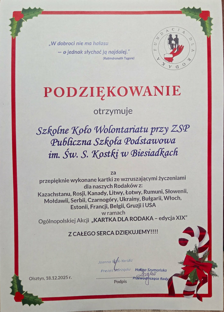 Akcja ta polega na wysyłaniu do Rodaków zamieszkałych poza granicami kraju, własnoręcznie wykonanych przez dzieci, świątecznych kartek pocztowych. Kartki zostaną wysłane do Polaków z m. in. Kazachstanu, Litwy, Białorusi. Wolontariusze wykonali 30 kartek (z własnoręcznym wpisem) – zgodnie z założeniami akcji