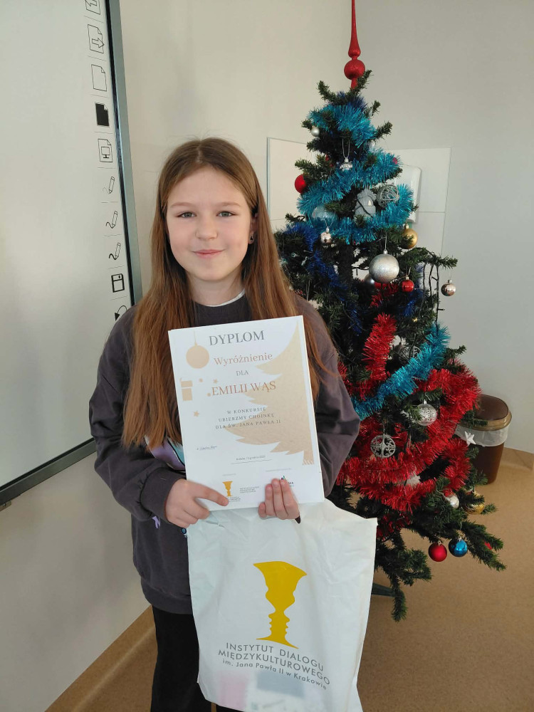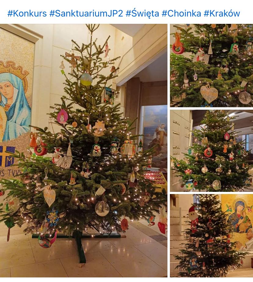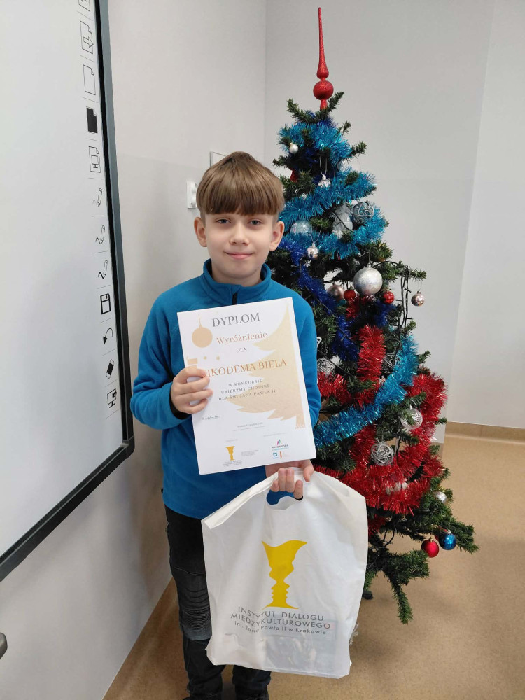 Zadaniem konkursowym było samodzielne stworzenie ozdoby świątecznej w formie zawieszki, którą udekorowano choinkę bożonarodzeniową w Sanktuarium św. Jana Pawła II w Krakowie. Emilia i Nikodem z klasy V zdobyli w tym konkursie wyróżnienie.