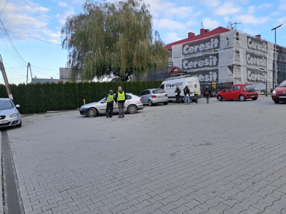 Na szkolnym parkingu młodzież rozdawała kierowcom i rodzicom ulotki przypominające o zasadach bezpieczeństwa na drodze oraz o tym, jak ważne jest noszenie elementów odblaskowych.