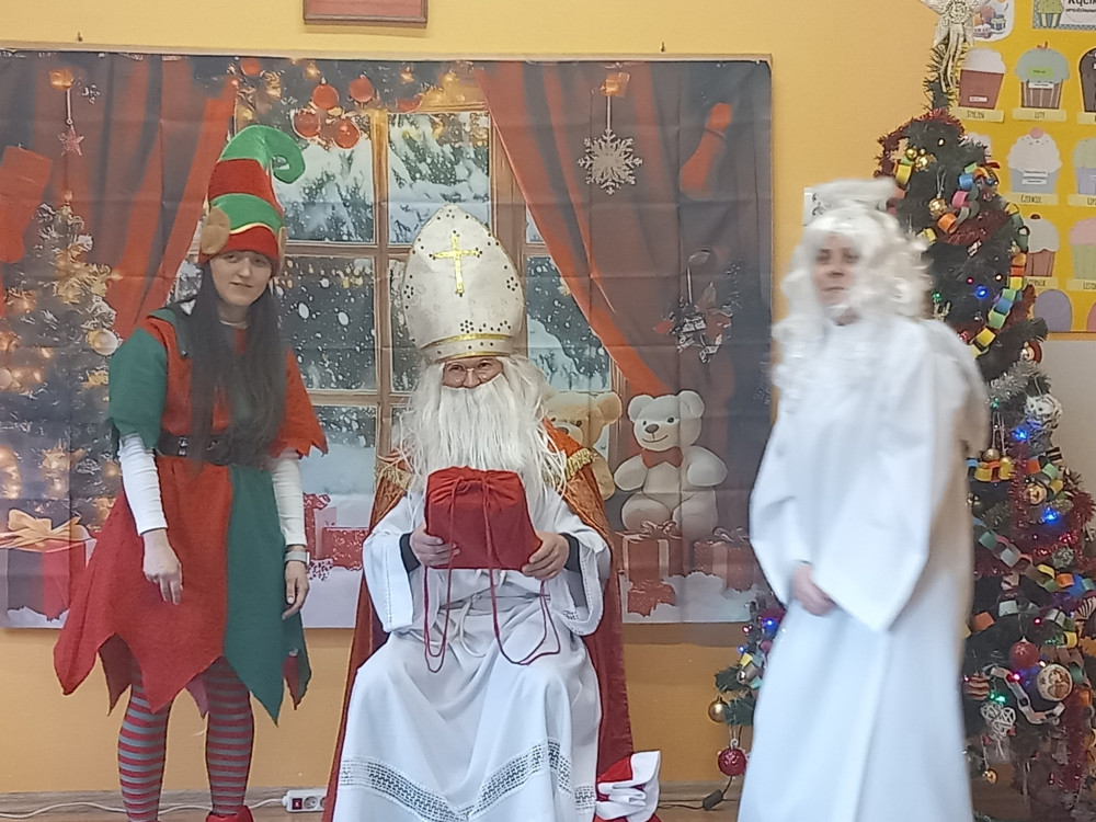 „6 grudnia – jak dobrze wiecie, Święty Mikołaj chodzi po świecie. Dźwiga swój worek niezmordowanie i każde dziecko prezent dostanie. A kiedy rozda już prezenty, wraca do nieba uśmiechnięty”