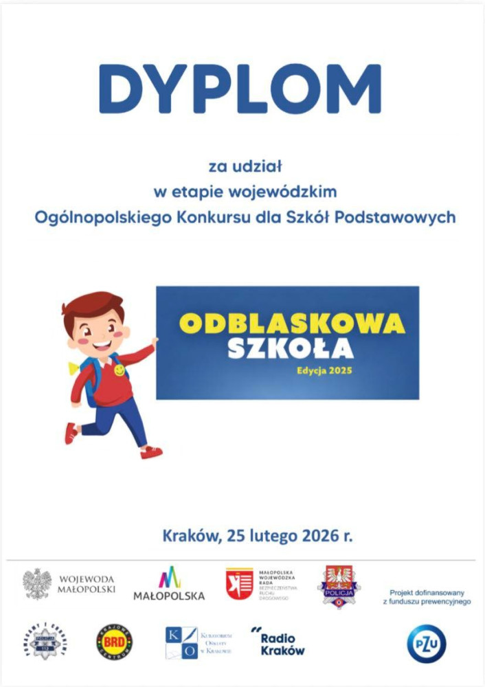 W tegorocznej edycji konkursu udział wzięły 223 szkoły z całego województwa małopolskiego, dlatego tym bardziej cieszy nas tak wysokie miejsce w klasyfikacji generalnej. Dodatkowo w powiecie brzeskim nasza szkoła zajęła 2 miejsce, co jest dla nas ogromnym powodem do dumy. To osiągnięcie jest efektem wspólnej pracy uczniów, nauczycieli, rodziców oraz wszystkich osób zaangażowanych w działania na rzecz bezpieczeństwa na drodze. W ramach konkursu realizowaliśmy wiele inicjatyw promujących noszenie odblasków, odpowiedzialne zachowanie na drodze oraz zwiększanie świadomości wśród najmłodszych uczestników ruchu drogowego. Dziękujemy wszystkim, którzy przyczynili się do tego sukcesu! Gratulujemy naszym uczniom za aktywność i zaangażowanie. Pamiętajmy – odblaski ratują życie!