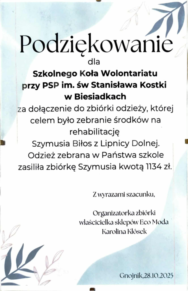 Dzięki ogromnemu zaangażowaniu całej społeczności szkolnej – zarówno uczniów jak i rodziców – udało się zebrać dużą ilość odzieży, którą przekazaliśmy firmie Eco Moda w Gnojniku. Na konto fundacji Serce dla Maluszka przekazaliśmy 1134 zł, które pomogą w dalszym leczeniu i terapii Szymonka